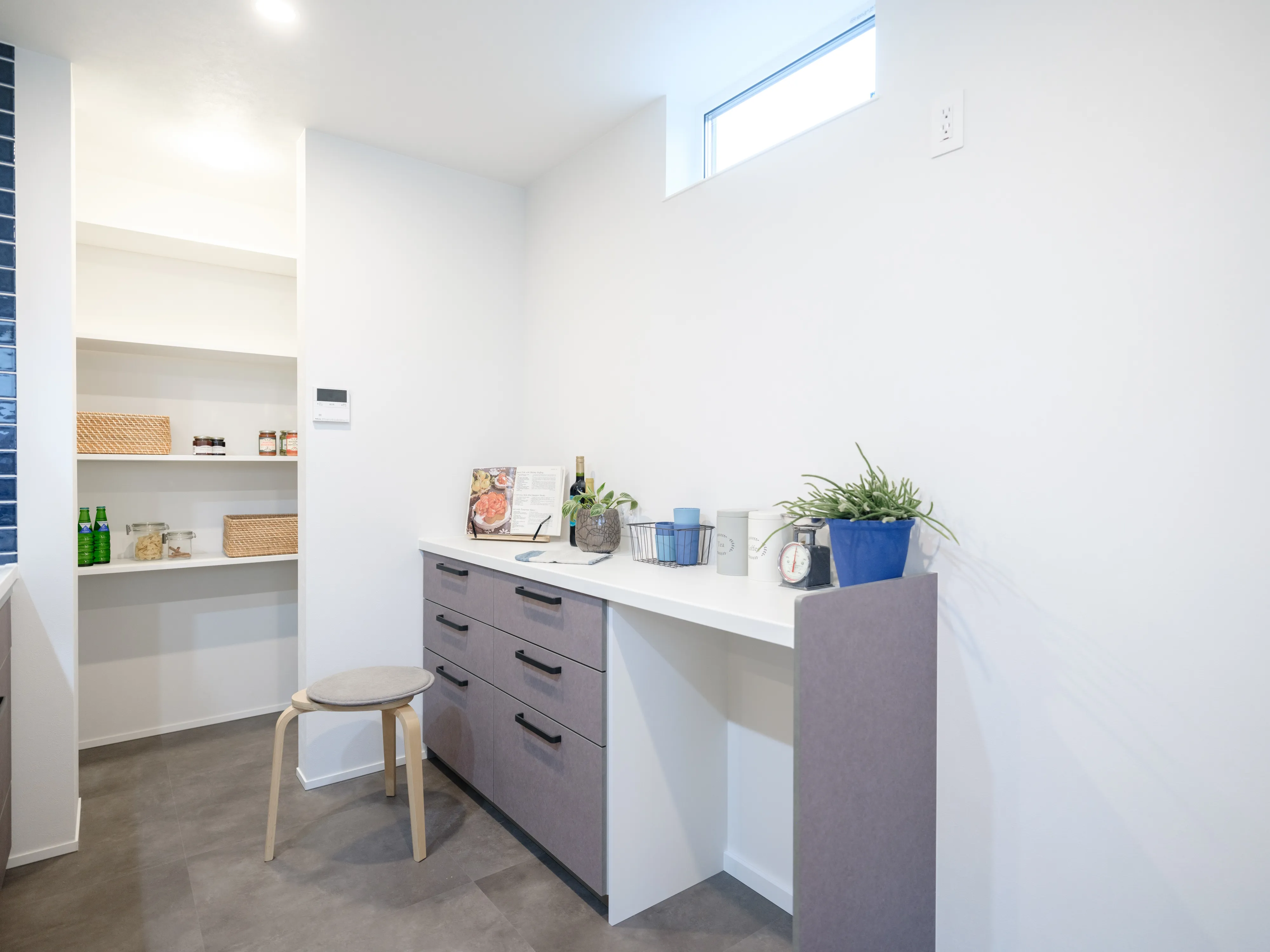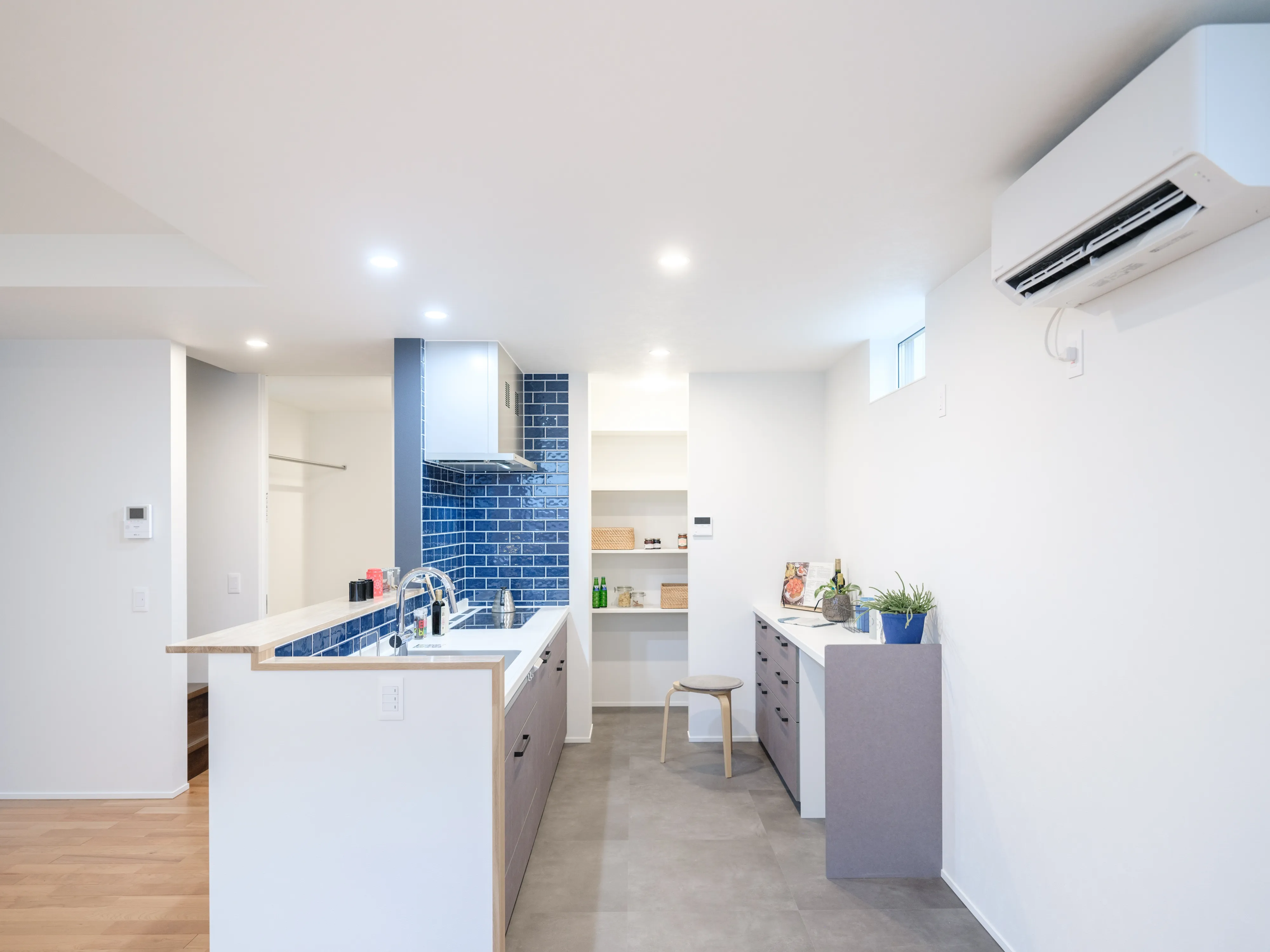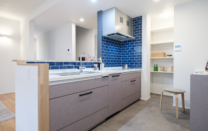 こだわりのブルータイルが印象的な、スタイリッシュで機能的なキッチン。フロントオープンの食洗機も搭載し、家事ラクも叶えます。